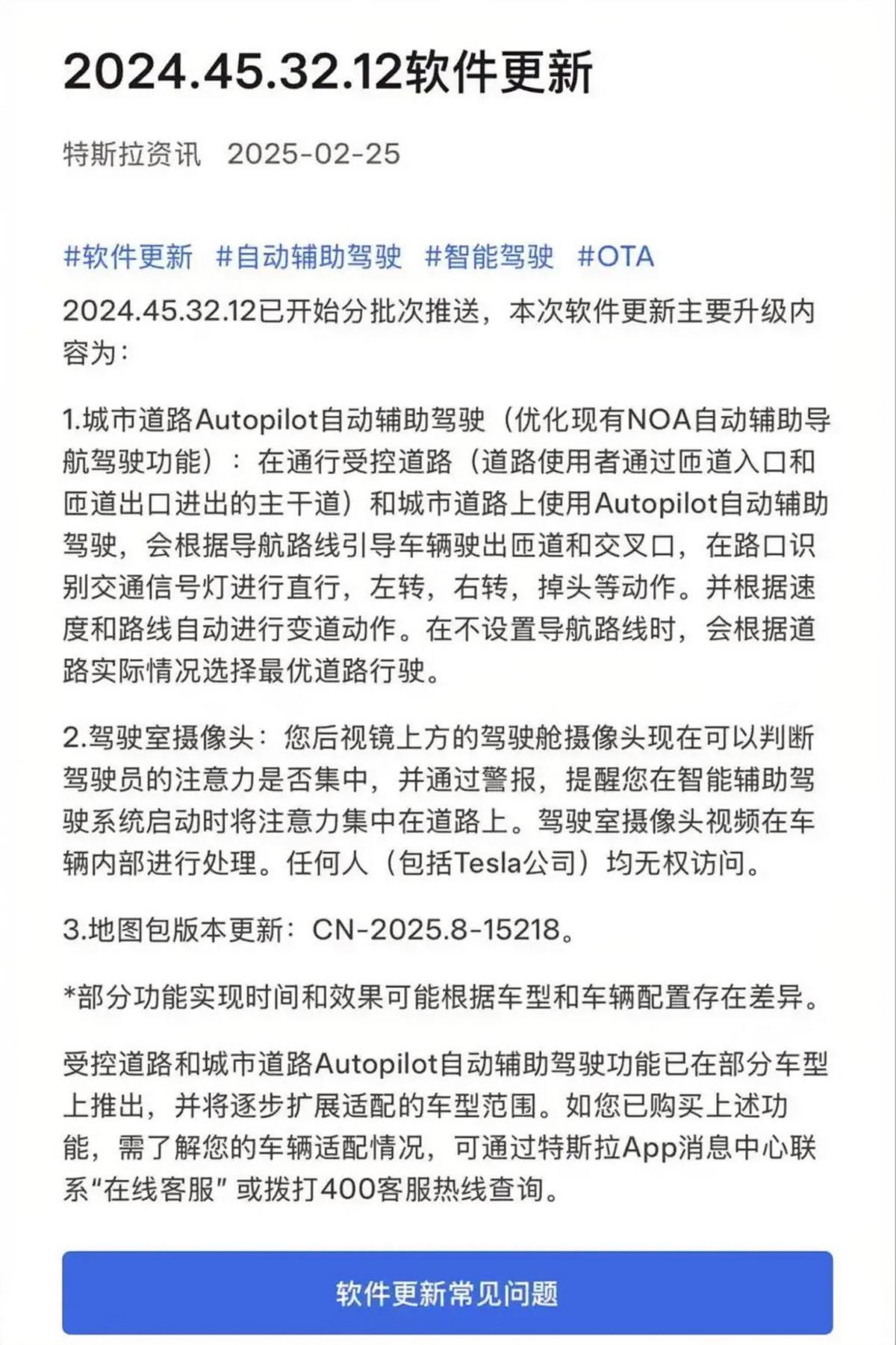 2月25日,特斯拉开始分批次为用户推送2024.45.32.12软件更新,更新的主要内容便是升级城市道路Autopilot自动辅助驾驶。
